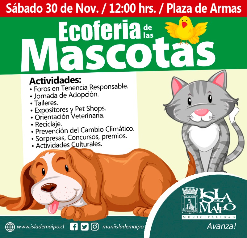 El sábado 30 de noviembre desde las 12.00 horas se desarrollará en la plaza de Armas de la comuna la primera versión de la 🐶🐱1° ECOFERIA DE MASCOTAS🐰🐹 de Isla de Maipo.