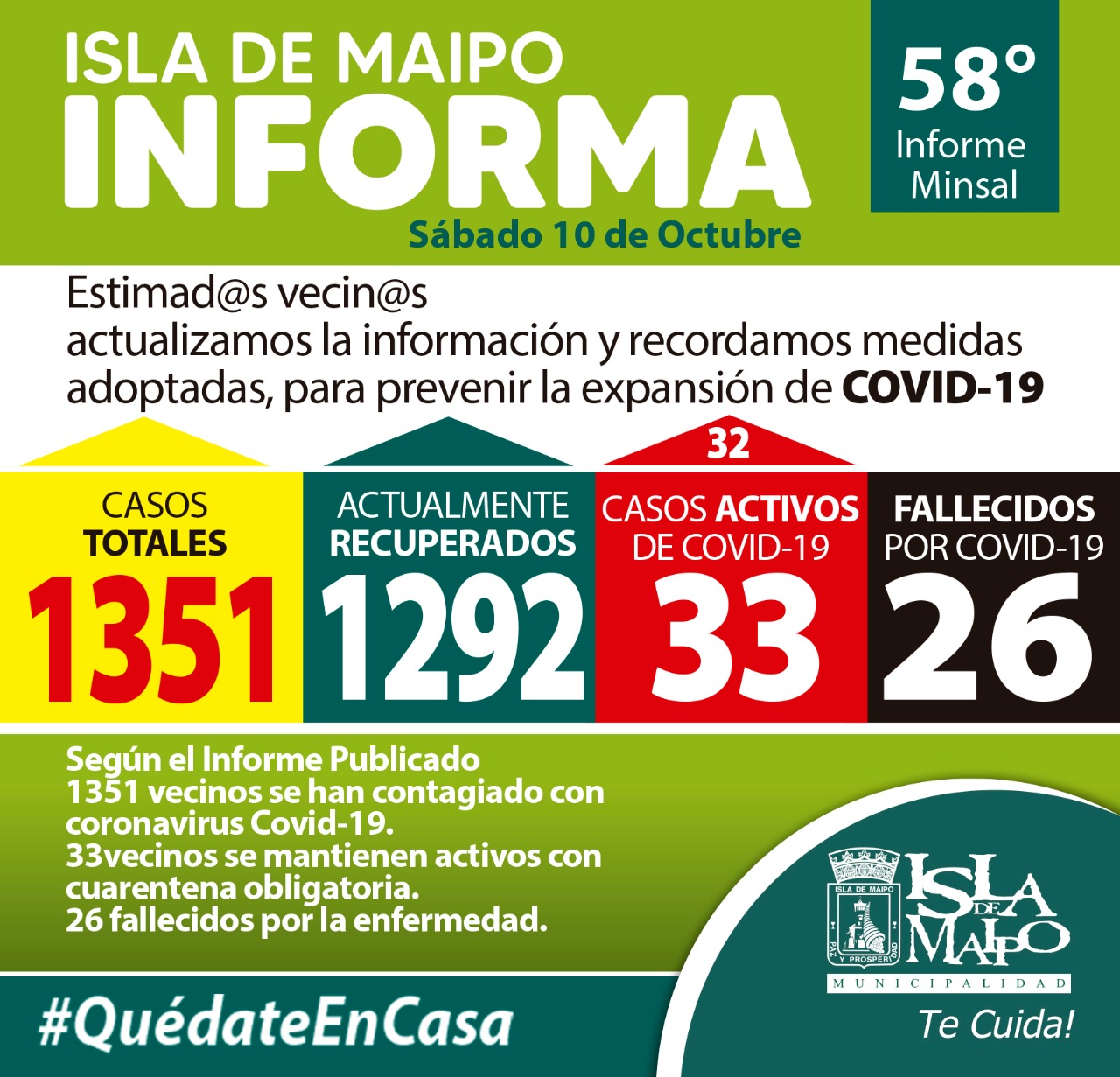 De acuerdo con el 58° Informe Epidemiológico publicado este sábado 10 de octubre por el Ministerio de Salud, Isla de Maipo registró una nueva alza de casos activos por coronavirus Covid-19, subiendo de 32 a 33 personas (1+ respecto al informe anterior). Además, el número de contagios acumulados de 1338 a 1351 (13+ respecto a informe anterior).