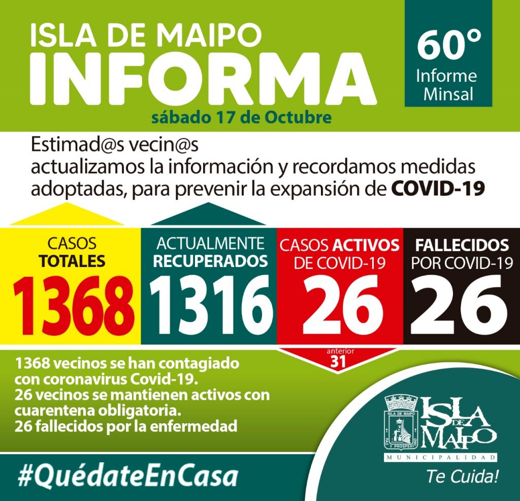 De acuerdo con el 60° Informe Epidemiológico publicado este sábado 17 de octubre por el Ministerio de Salud, Isla de Maipo registró una segunda baja consecutiva en los casos activos por coronavirus.
