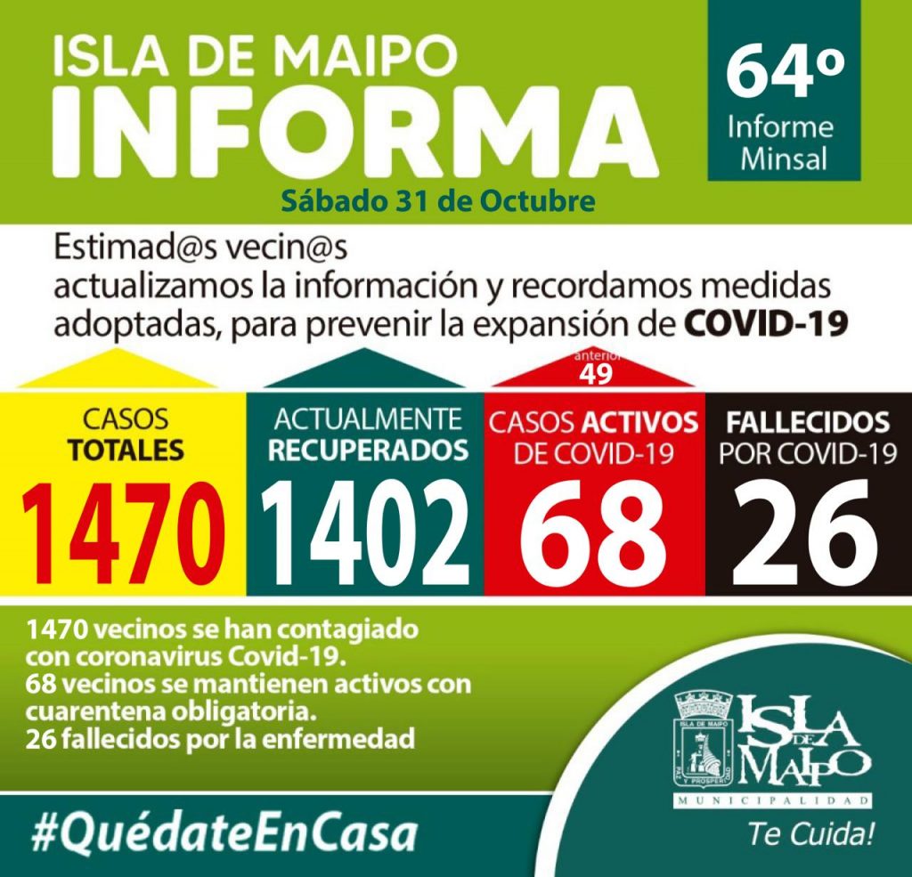 64° INFORME MINSAL: ISLA DE MAIPO CUENTA CON 68 CONTAGIOS ACTIVOS POR COVID-19