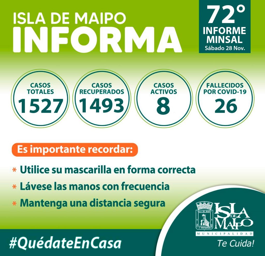 De acuerdo con el 72° Informe Epidemiológico publicado este sábado 28 de noviembre en www.minsal.cl, Isla de Maipo registró la primera alza de casos activos por coronavirus luego de siete bajas consecutivas.