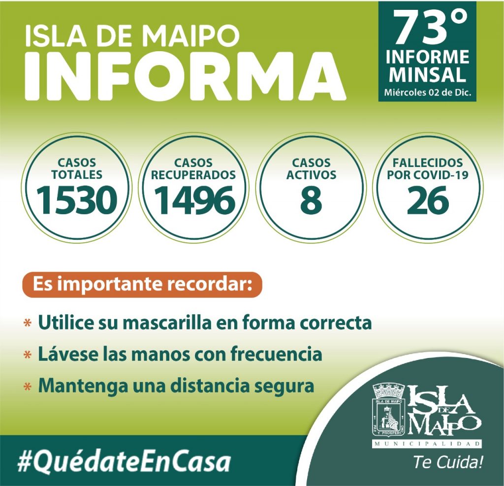 De acuerdo con el 73° (septuagésimo tercer) Informe Epidemiológico publicado ayer miércoles 2 de diciembre en www.minsal.cl, Isla de Maipo registró un estancamiento de los casos activos por coronavirus.