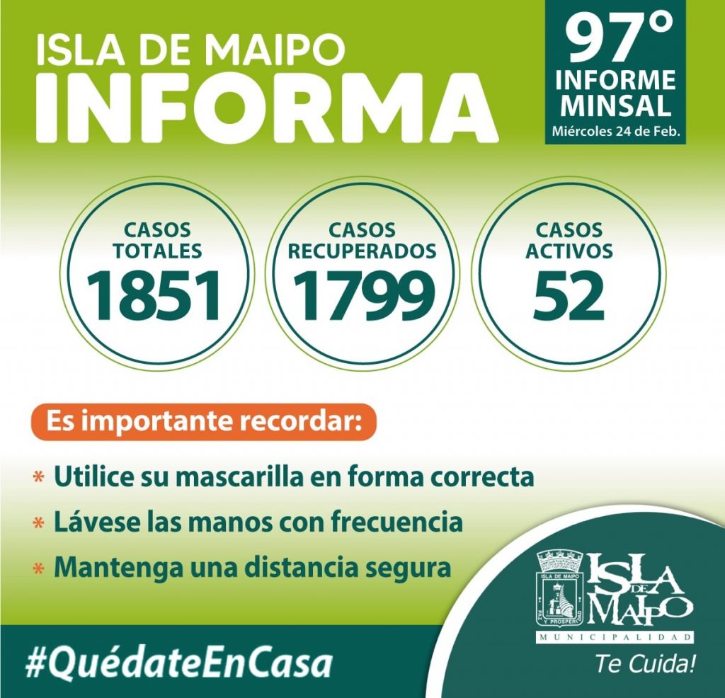 De acuerdo con el 97° (nonagésimo séptimo) Informe Epidemiológico publicado este miércoles 24 de febrero en www.minsal.cl, Isla de Maipo experimentó una nueva alza de sus casos activos por coronavirus.