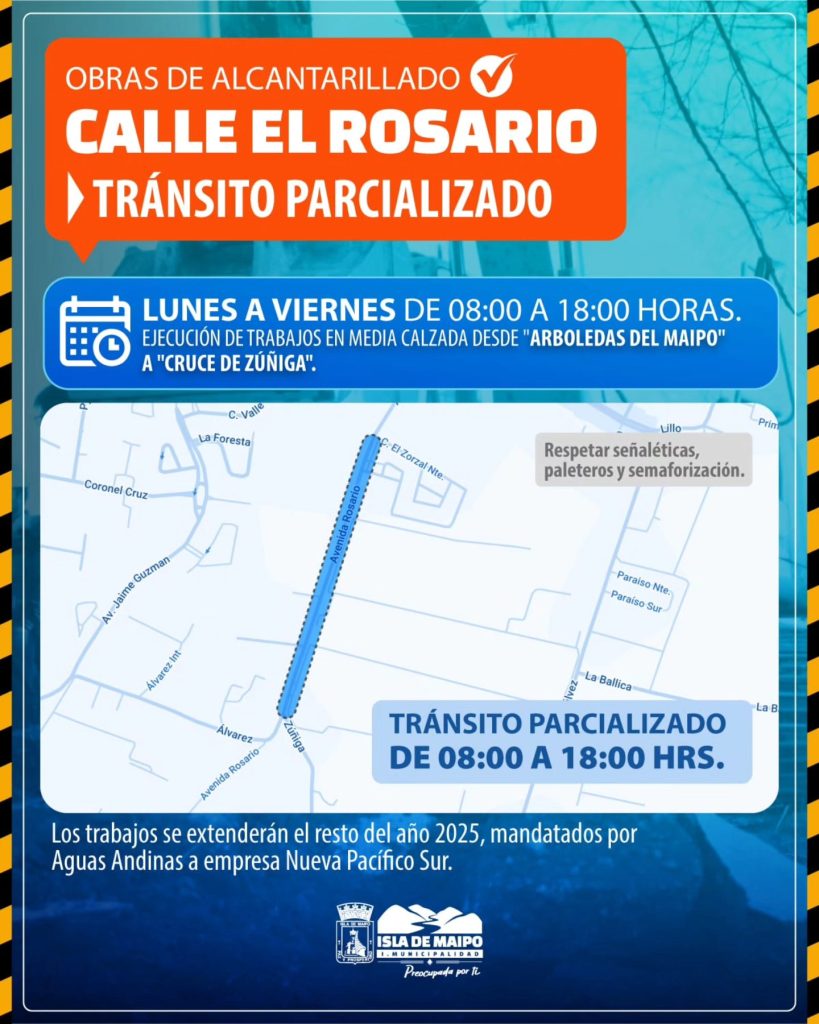 Debido a la ejecución de obras primordiales del alcantarillado en calle El Rosario, el municipio informa que se parcializa el tránsito vehicular en el tramo que comprende “Arboledas del Maipo” a cruce “Zúñiga”.