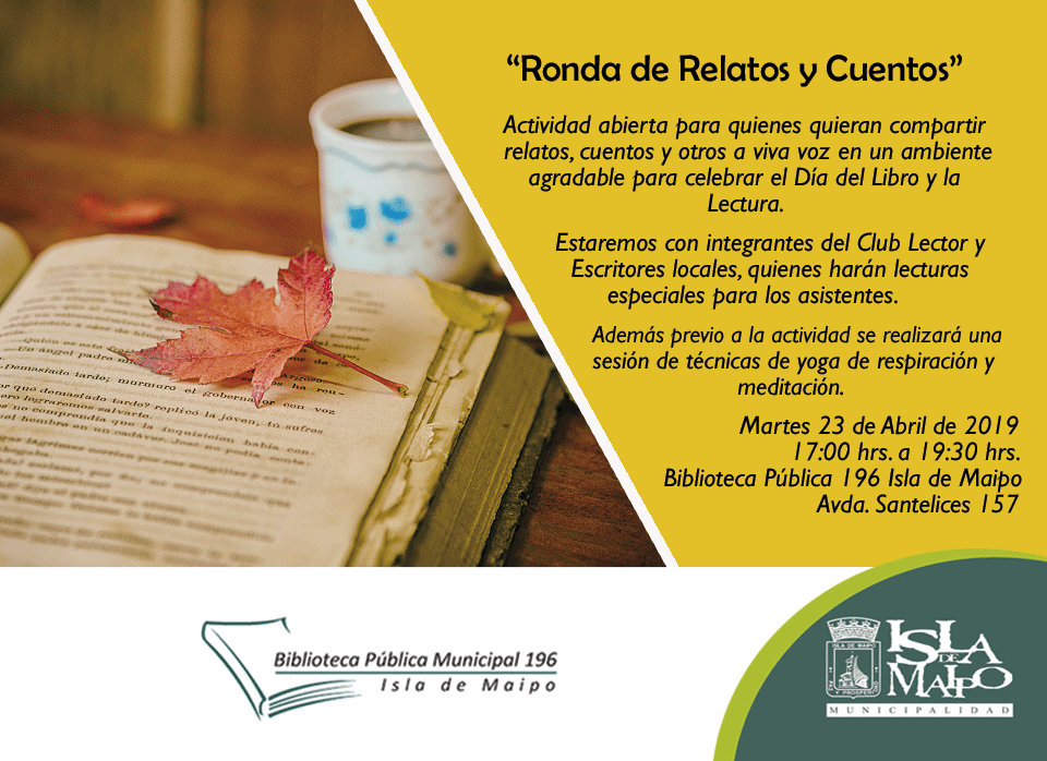 “En la Biblioteca realizaremos una actividad titulada “Ronda de Relatos y Cuentos”, de carácter abierto que tiene como objetivo compartir lecturas a viva voz, de extractos de libros favoritos, poesías, escritos propios, etc., estaremos acompañados de integrantes del Club Lector y Escritores Locales. Además alrededor de las 16:30 hrs. y previo al inicio de la actividad, se realizará una sesión de herramientas básicas de yoga, de respiración y meditación a cargo de “Sala Manada”, señaló Soledad Lillo, encargada de la Biblioteca Pública Municipal Nº 196, Isla de Maipo.