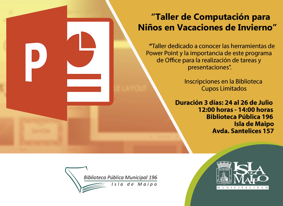 “Les recordamos que hay cupos limitados para participar en el Taller de Computación para Niños en Vacaciones de Invierno, en donde se revisarán las herramientas de Power Point. El taller tiene una duración de 3 días y comenzará el 24 de Julio hasta el 26 de Julio, el horario es de 12:00 a 14:00 horas. Se pueden inscribir en la Biblioteca o contactarnos en nuestras redes sociales”. 😁💻