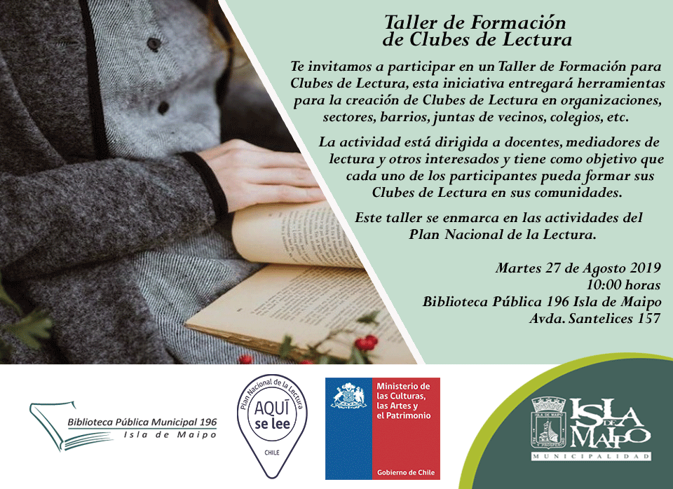 La próxima semana se realizará en la Biblioteca de Isla de Maipo un Taller de Formación para Creación de Clubes de Lectura, pensado en quienes siempre han querido realizar alguna actividad de fomento lector en su organización, junta de vecinos, colegios u otros lugares.