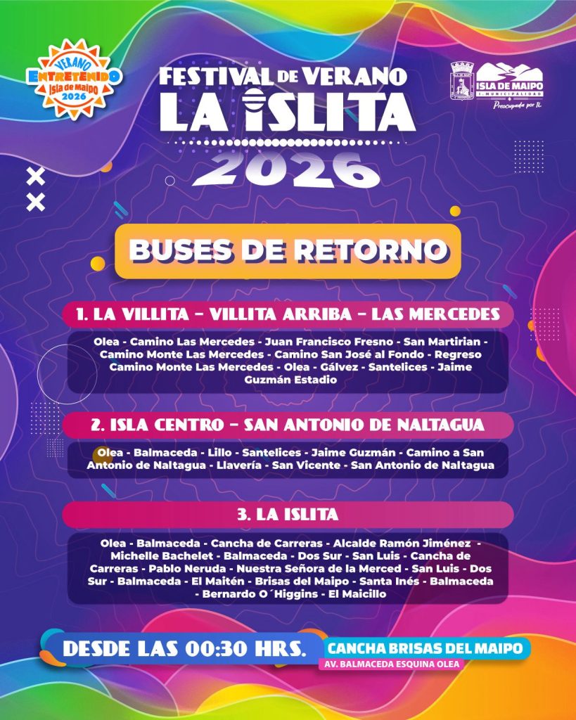El Municipio confirmó buses de retorno gratuito al término del Festival de Verano La Islita 2026. Serán 3 servicios simultáneos que partirán a las 00:30 horas del domingo 1 de febrero (al término del evento) desde la cancha del Club Deportivo Brisas del Maipo (Av. Balmaceda esquina Olea).