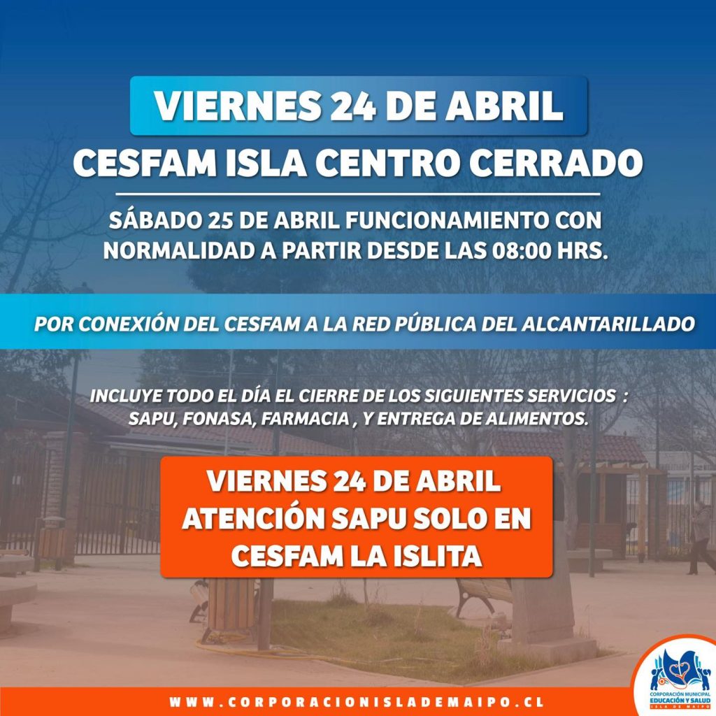 La Corporación Municipal de Salud y Educación de Isla de Maipo informó que este viernes 24 de abril el Consultorio de Isla Centro permanecerá cerrado por trabajos de conexión del recinto al sistema de alcantarillado público.