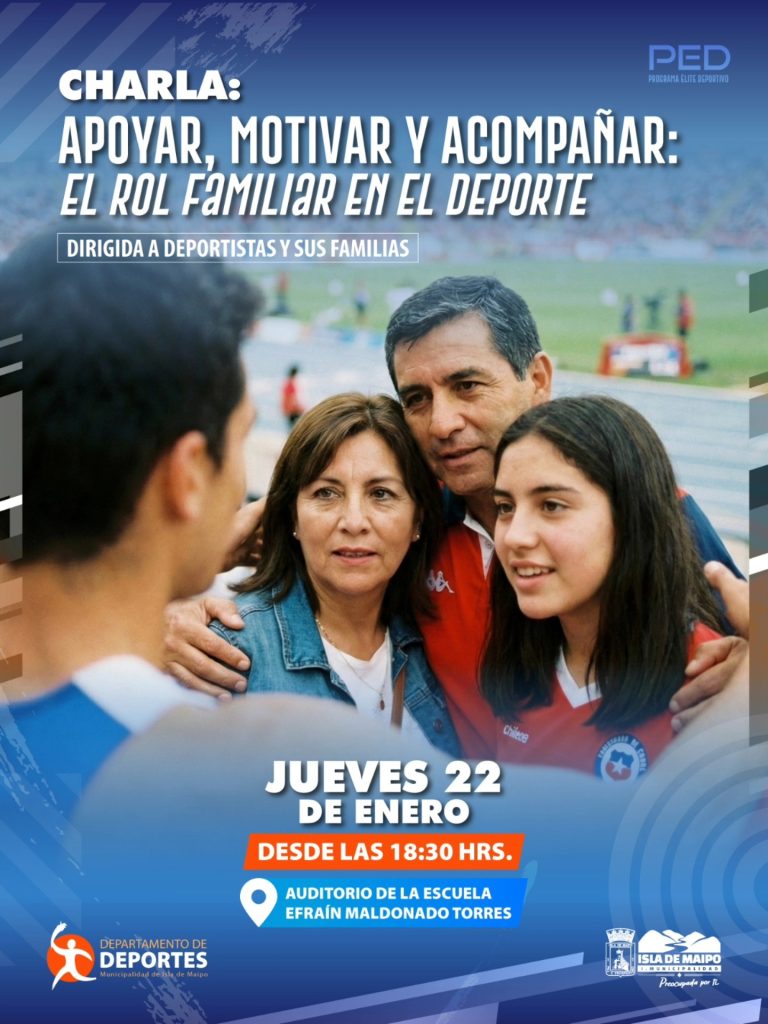 El Departamento Municipal de Deportes invita a los atletas de Isla de Maipo y sus familias a participar gratis de la charla sobre la importancia del apoyo, motivación y acompañamiento de los padres hacia sus hijos deportistas.