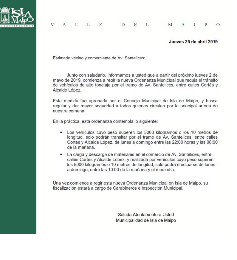 El Pleno del Concejo Municipal de Isla de Maipo aprobó la nueva Ordenanza Municipal que regula el horario de circulación de vehículos de más de 5 toneladas o 10 metros de longitud, por el tramo de Av. Santelices entre calles Cortés y Alcalde López.
