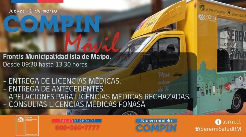 La Oficina Móvil de la COMPIN (Comisión de Medicina Preventiva e Invalidez) del Ministerio de Salud, confirmó atención en municipalidad de Isla de Maipo mañana jueves 12 de marzo, desde las 9.30 de la mañana hasta las 14.00 horas.