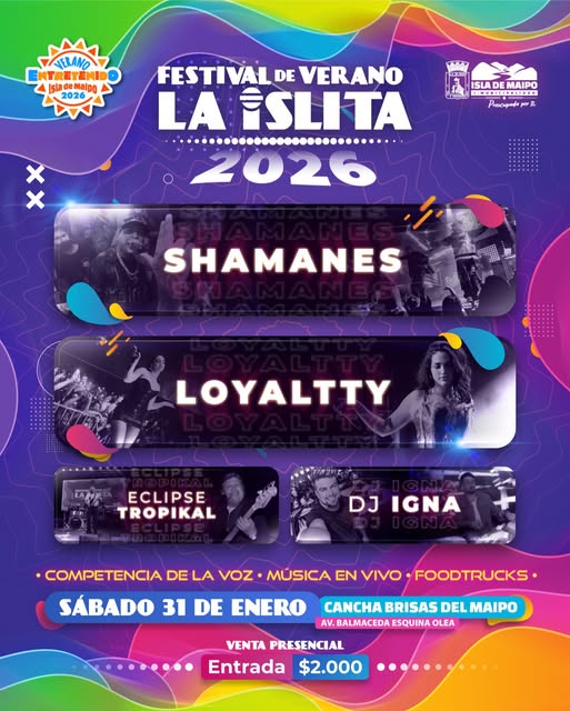 El municipio confirmó la programación completa de artistas que estarán en el próximo Festival de Verano La Islita 2026. El evento que se realizará el 31 de enero en la cancha del Club de Fútbol Brisas del Maipo contará con el show en vivo de: