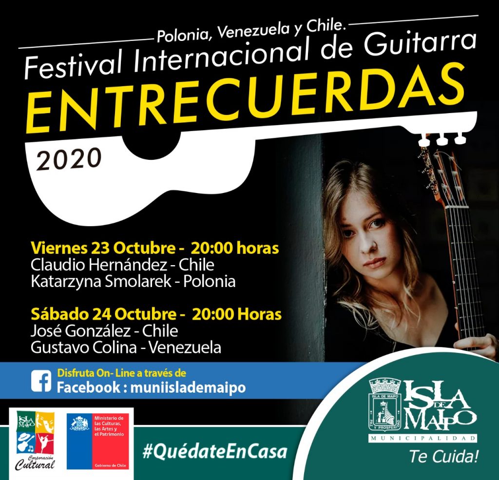 Este año 2020 regresa de una manera distinta por motivo de la pandemia el Festival Internacional de Guitarra “Entrecuerdas”. El evento que por más de 12 años se presenta en nuestra comuna, está programado para los días 23 y 24 de octubre a través de la transmisión de Facebook Live desde la fanpage “Municipalidad Isla de Maipo”.