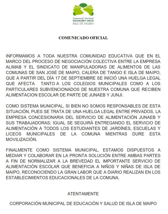 CORPORACIÓN MUNICIPAL DE EDUCACIÓN Y SALUD DE ISLA DE MAIPO ENTREGÓ COMUNICADO SOBRE HUELGA DE MANIPULADORAS DE ALIMENTOS