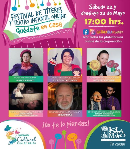 El próximo 22 y 23 de mayo la Corporación Cultural de Isla de Maipo presentará su Festival de Títeres y Teatro Infantil Online “Quédate en casa” pensada para toda la familia, en especial los más pequeños del hogar.