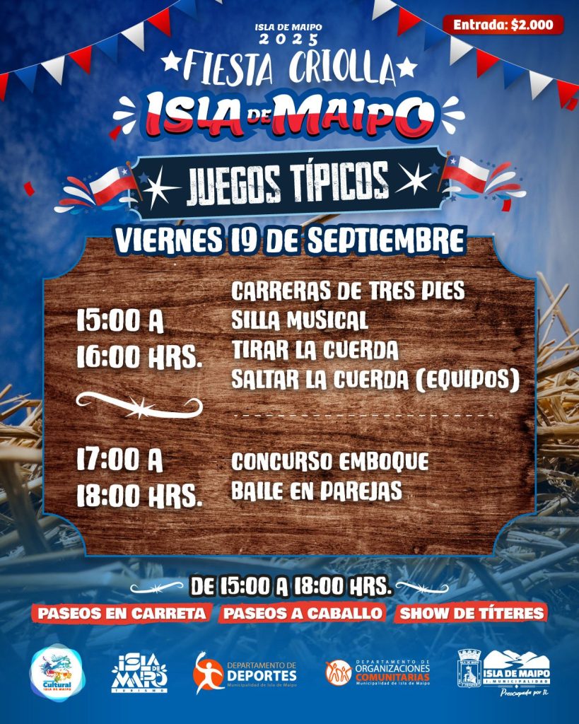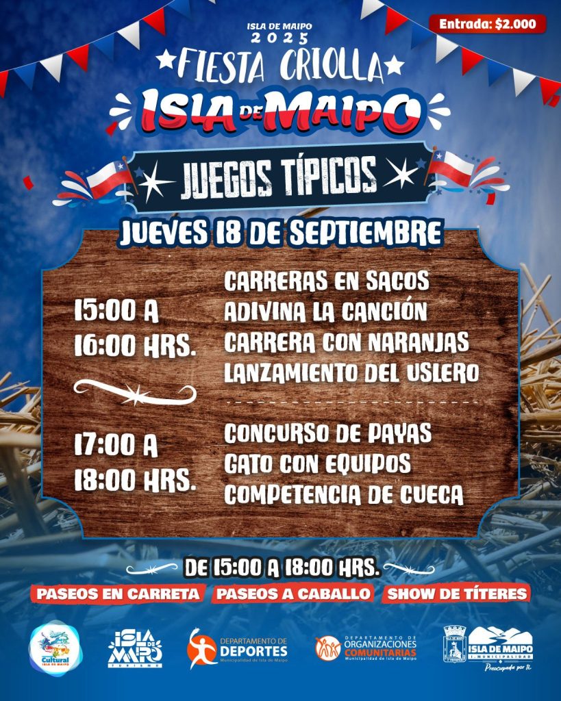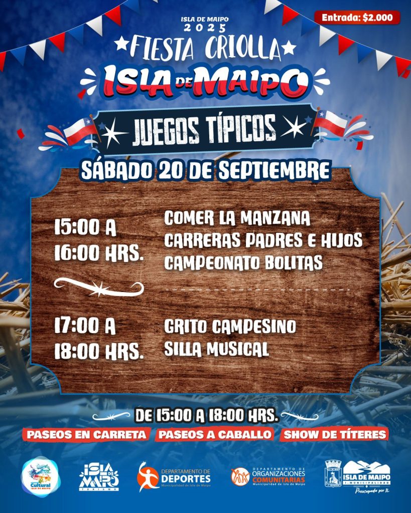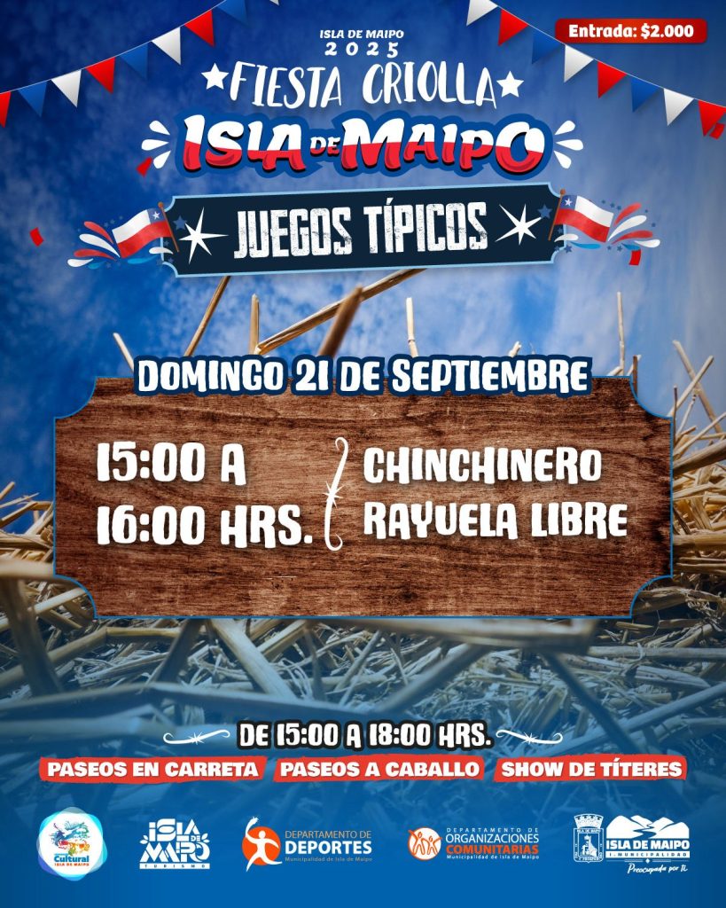 Como es tradición, la Fiesta Criolla de Isla de Maipo tendrá un espacio de juegos típicos durante las 4 jornadas de celebración del 18 al 21 de septiembre en el Estadio Municipal Fernando Prieto Concha (Av. Jaime Guzmán).