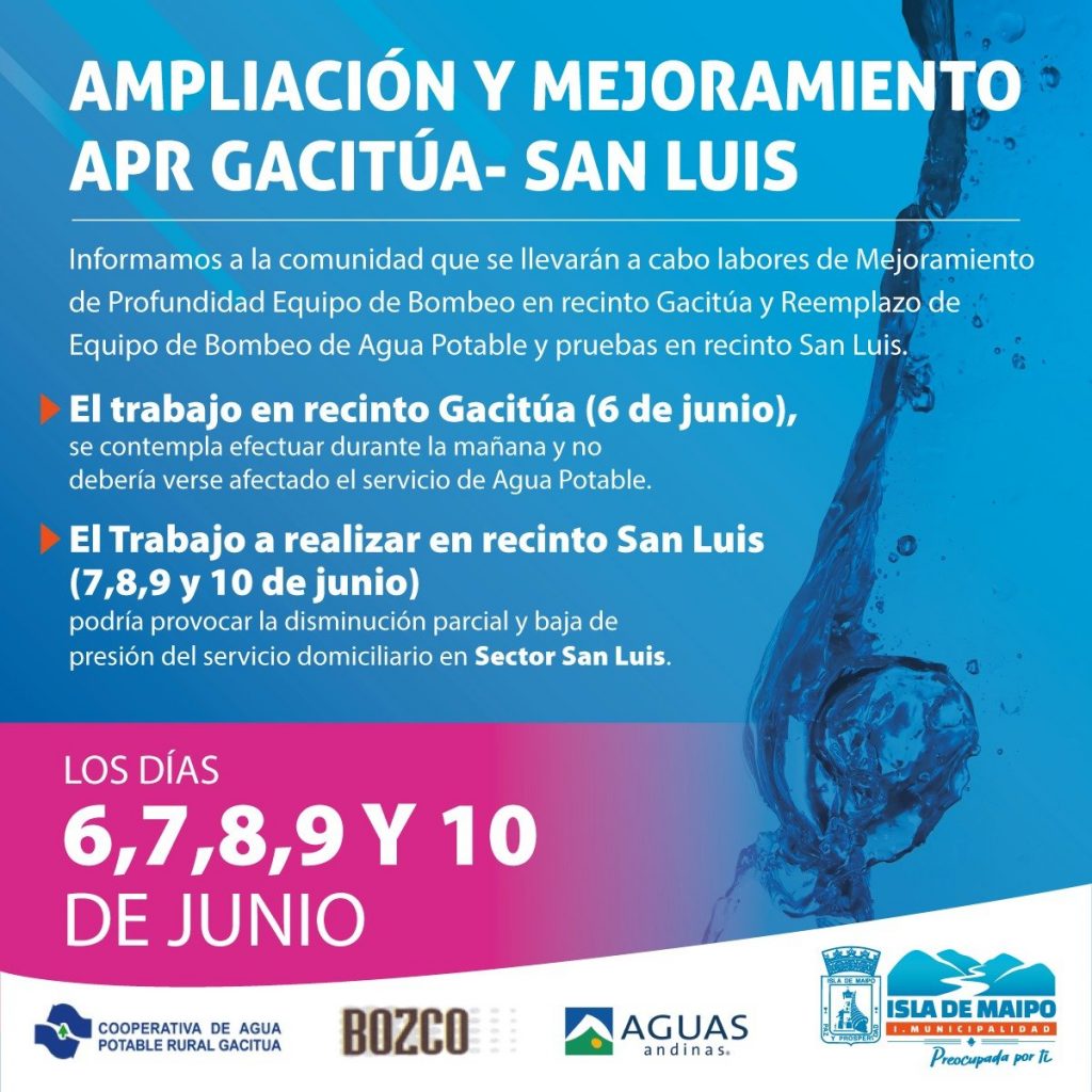 La empresa Bozco, a cargo del proyecto de ampliación y mejoramiento de la APR Gacitúa – San Luis, informó de las próximas intervenciones que tendrán lugar el mismo recinto del comité y desde el día lunes 6 al viernes 10 de junio.