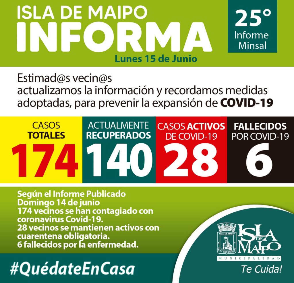 Respecto a Isla de Maipo, el 25° Informe Epidemiológico publicado el domingo 14 de junio pasado por el Minsal, reportó 174 contagiados a la fecha, 28 de ellos activos y 6 personas fallecidas por coronavirus.