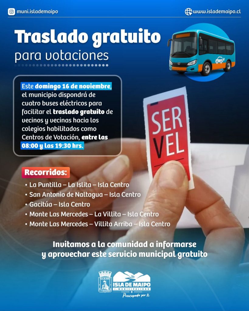 Por disposición del alcalde Juan Pablo Olave, el municipio dispuso de buses de acercamiento para las elecciones presidenciales y parlamentarias de este domingo 16 de noviembre en Isla de Maipo.