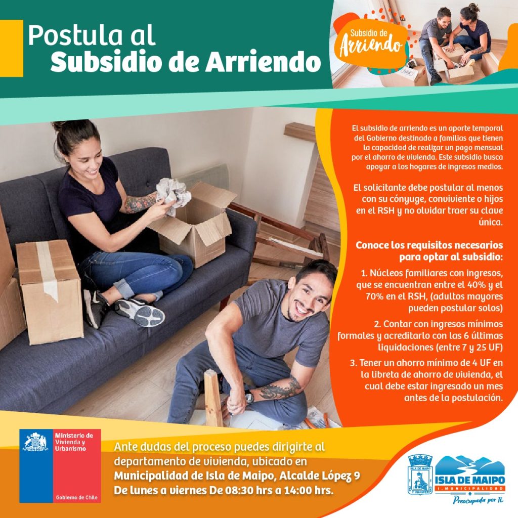El llamado es a las familias de Isla de Maipo, cuyos requisitos destacan pertenecer entre el 40% y 70% más vulnerables según el Registro Social de Hogares, a postular al Subsidio de Arriendo de una vivienda impulsado por el Gobierno.