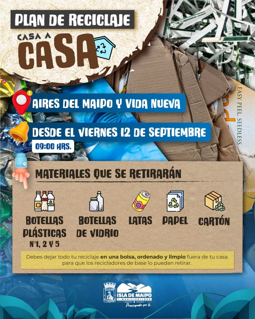 Este viernes 12 de septiembre se inicia el proyecto de reciclaje casa a casa en Isla de Maipo. La iniciativa es pionera en la RM y consiste en el trabajo conjunto entre municipio y agrupaciones de recicladores de base de nuestra comuna quienes se comprometen al retiro de residuos como plástico, vidrio, papel, cartón, lata o aluminio desde los hogares.