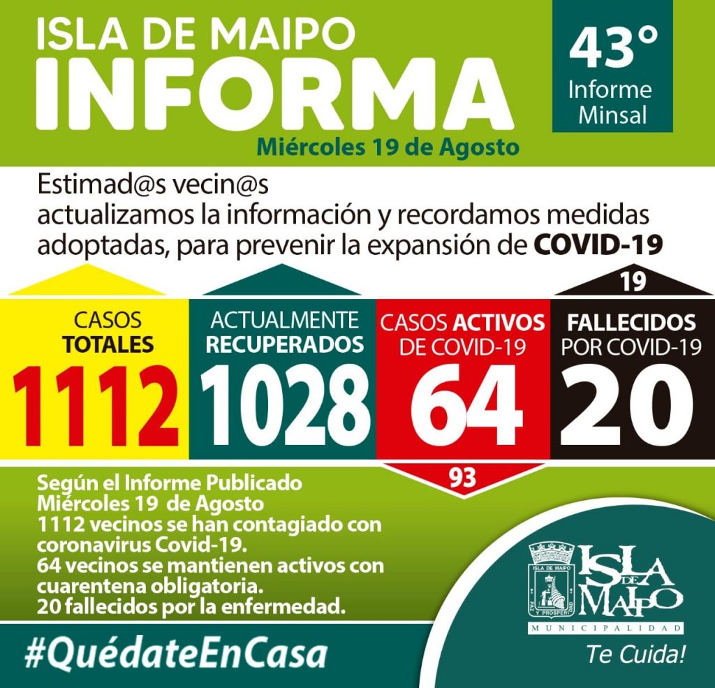 Además, el número de contagios acumulados subió de 1100 a 1112 (+12). Sin embargo, la mala noticia es la confirmación de 1 nuevo fallecido, sumando a la fecha 20 muertes por coronavirus en Isla de Maipo.