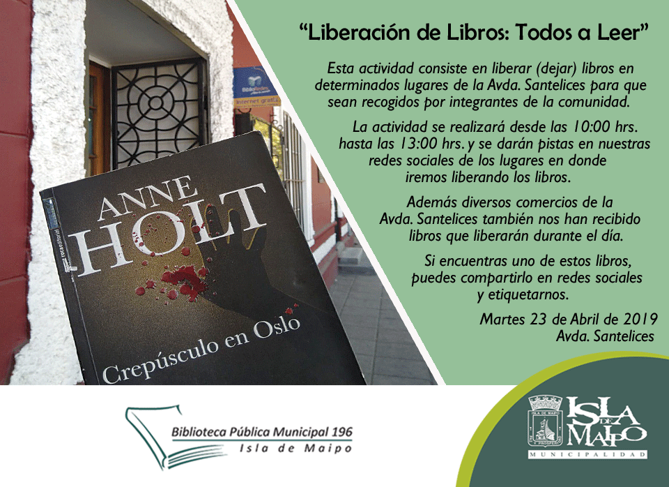 Durante el día de hoy, martes 23 de abril, la biblioteca pública municipal de Isla de Maipo celebra el “Día Internacional del Libro y la Lectura” con diversas actividades, comenzando con la liberación de libros los que ya se están preparando para salir.