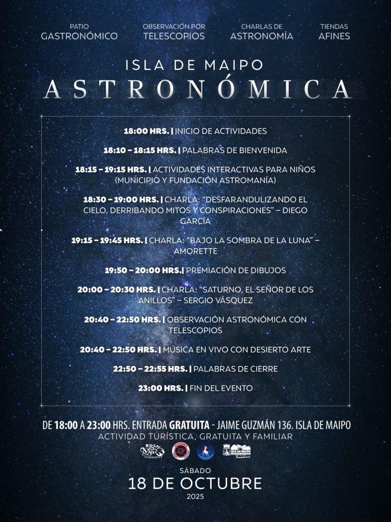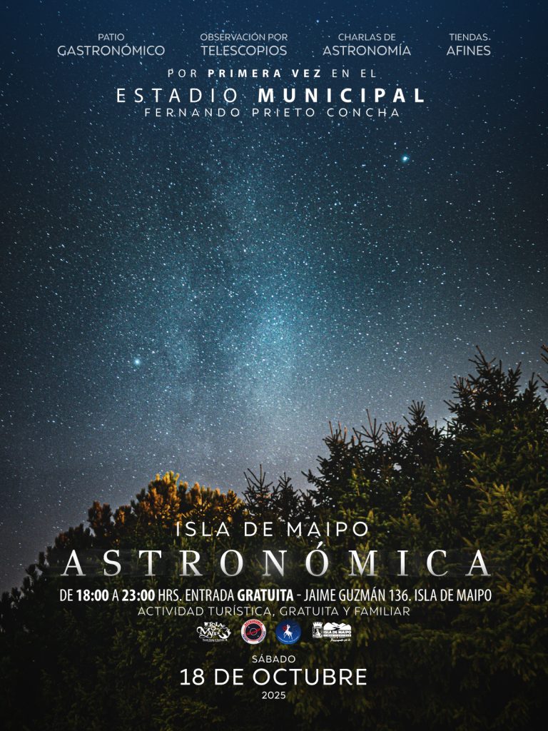 El municipio organiza una atractiva actividad familiar y al aire libre para el próximo 18 de octubre. “Isla de Maipo Astronómica” en el Estadio Municipal Fernando Prieto Concha contará con observación con telescopios, charlas sobre astronomía, stands con venta de productos afines y patio gastronómico para toda la familia.