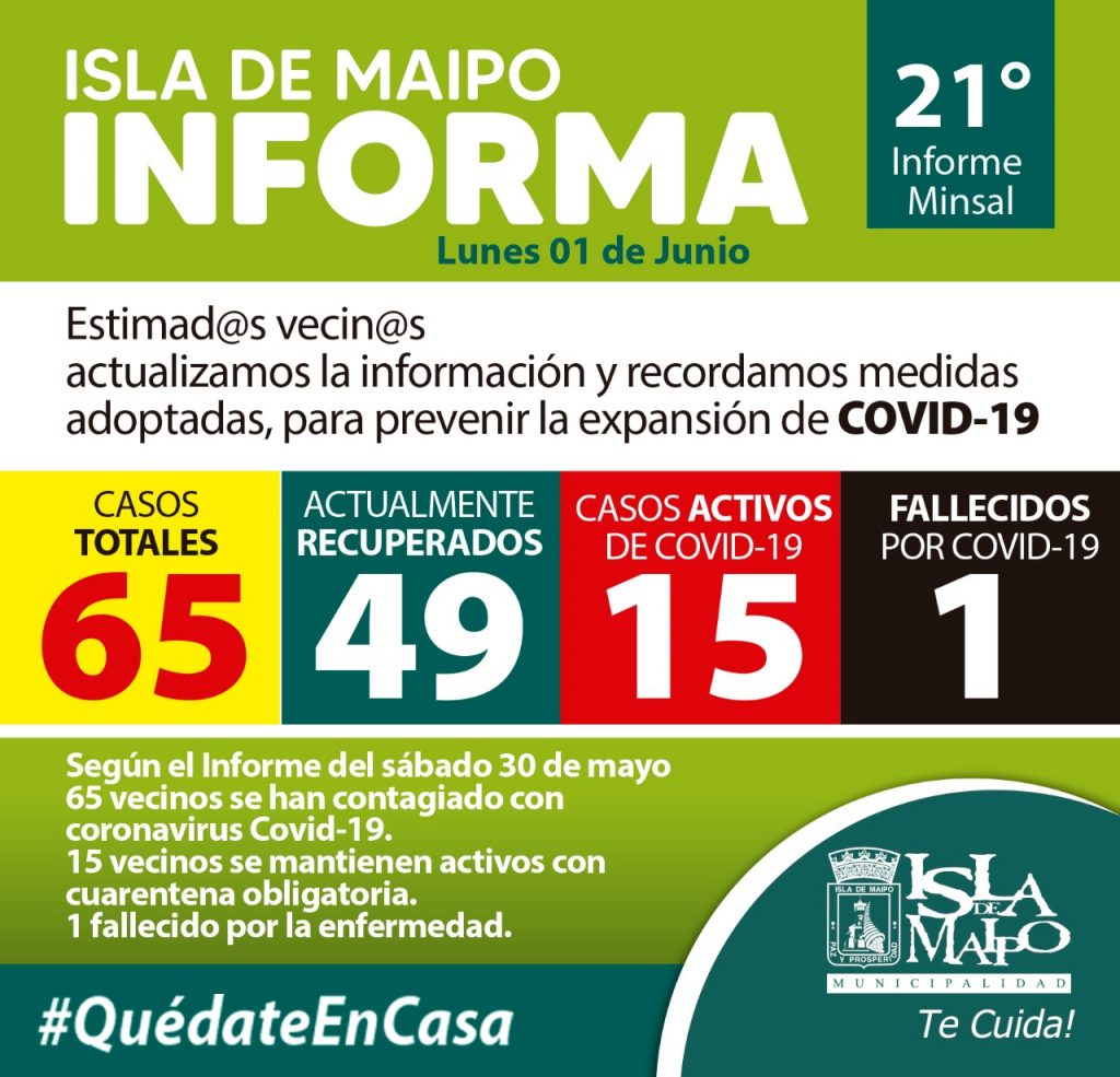 Este 30 de mayo, se confirmó la primera persona fallecida por coronavirus Covid-19 en Isla de Maipo. Además, este mismo sábado se conoció el 21° informe epidemiológico elaborado por el Ministerio de Salud, que confirmó un total de 65 contagiados a la fecha en nuestra comuna, 15 de ellos en estado activo..
