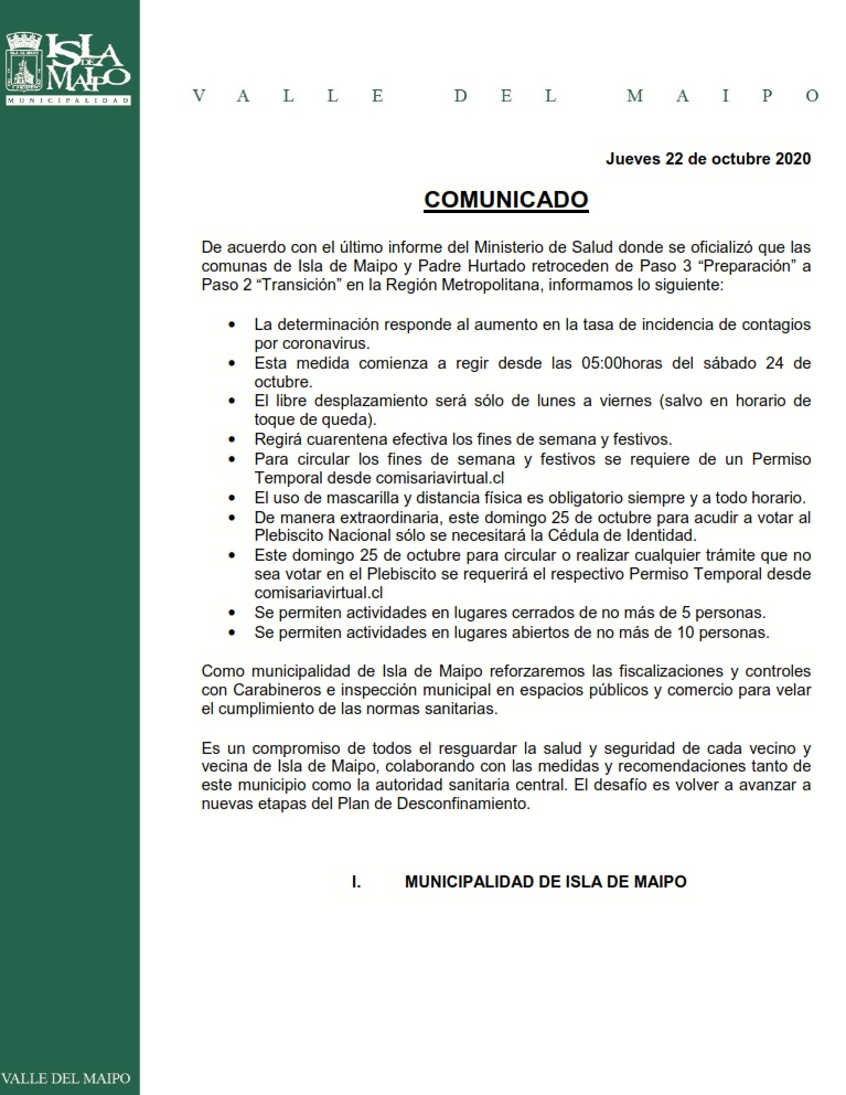 El municipio de Isla de Maipo emitió un comunicado oficial respecto a esta decisión, detallando las restricciones que esta medida significa en la práctica.