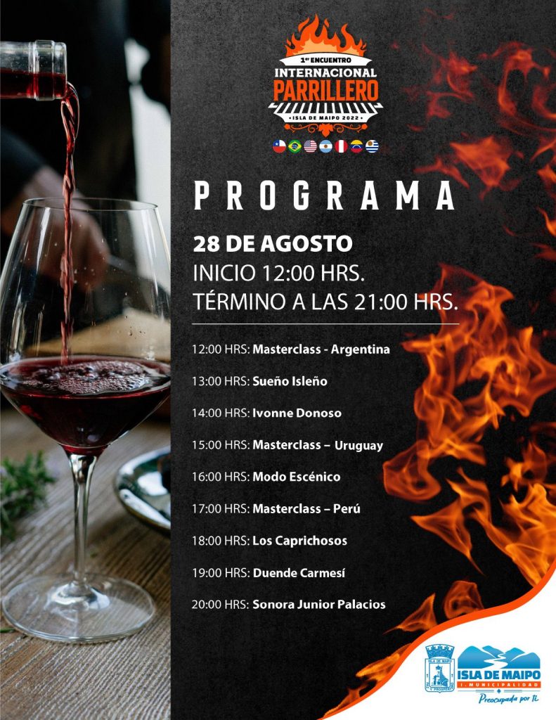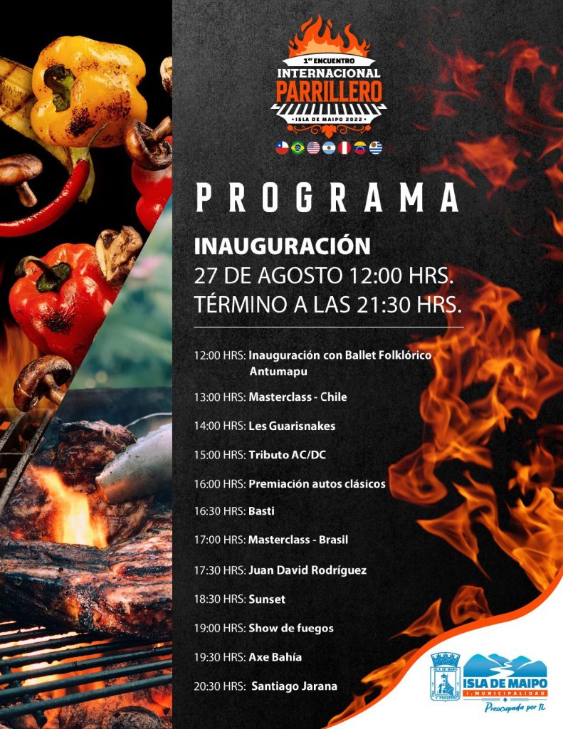 Una gran fiesta culinaria pensada para toda la familia y vecinos es lo que se vivirá este sábado 27 y domingo 28 de agosto en Avenida Santelices de Isla de Maipo. Se trata del 1° Encuentro Interncional Parrillero con los mejores exponentes de Latinoamérica y Estados Unidos.