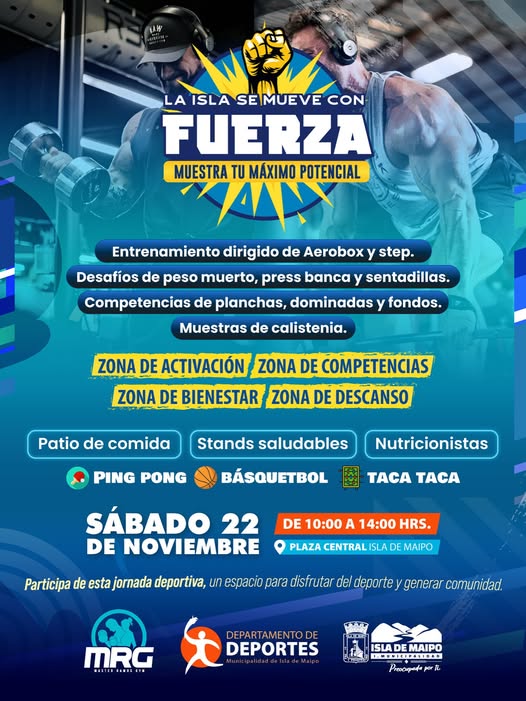 “La Isla se Mueve con Fuerza”. El Municipio de Isla de Maipo y su departamento de deportes invitan a todos los amantes del fitness, alimentación saludable y actividad física a una gran jornada de activación y competencias al aire libre el próximo sábado 22 de noviembre.