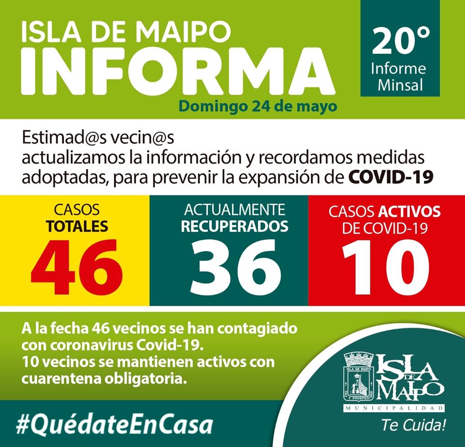 De acuerdo con el 20° Informe Epidemiológico emitido este miércoles por el Ministerio de Salud, se confirma que al 24 de mayo un total de 46 personas se han contagiado por Covid-19 en Isla de Maipo, 10 de ellos activos.