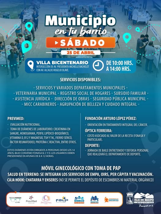 Vuelve el “Municipio en tu barrio” con atenciones y servicios públicos este sábado 25 de abril en Villa Bicentenario. El operativo está programado desde las 10:00 de la mañana a 14:00 horas en la intersección de Av. Michelle Bachelet con calle Alcalde Rogelio Olave.