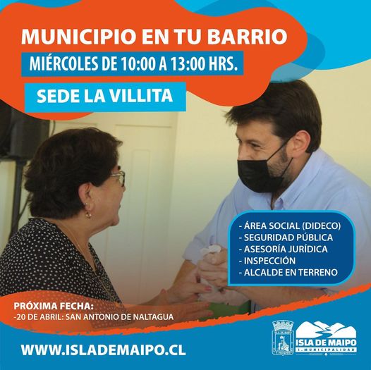 A contar de las 10.00 de la mañana hasta las 13.00 horas de este miércoles 13 de abril, los vecinos pueden acercarse a la sede social de La Villita (Gálvez 2040) para un nuevo “Municipio en tu Barrio” solicitar atención o audiencias con el alcalde Juan Pablo Olave.
