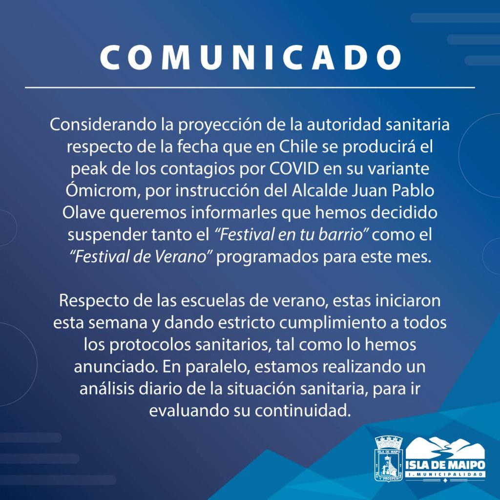 Considerando la proyección de la autoridad sanitaria respecto de la fecha que en Chile se producirá el peak de los contagios por Covid en su variante Ómicron, por instrucción del alcalde Juan Pablo Olave queremos informarles que hemos decidido suspender tanto el Festival en tu Barrio como el Festival de Verano programado para este mes.