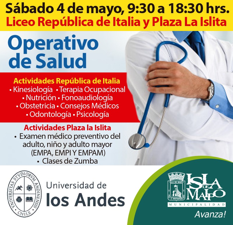 MUNICIPIO Y U. DE LOS ANDES INVITAN A OPERATIVO DE SALUD EN LA ISLITA ESTE SÁBADO 4 DE MAYO DE 9.30 A 18.30 HORAS EN PLAZA Y LICEO REPÚBLICA DE ITALIA