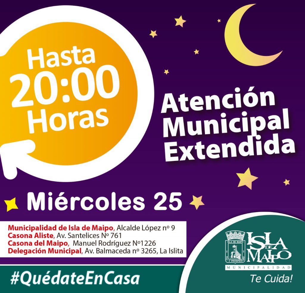 Este miércoles se retoma una nueva jornada de atención municipal con horario extendido y continuado hasta las 20.00 horas. El Plan de Mejoramiento de la Gestión funcionará este 25 de noviembre en las oficinas de atención de público de la Municipalidad de Isla de Maipo, Delegación de La Islita, Casona Aliste y Casona del Maipo.
