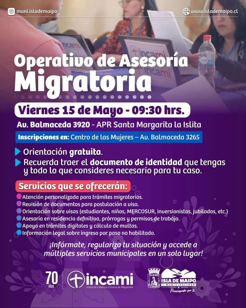 Se confirma un nuevo Operativo de Asesoría Migratoria en Isla de Maipo. La actividad municipal está programada para el próximo viernes 15 de mayo en las dependencias de la Cooperativa de Agua Potable Santa Margarita (Av. Balmaceda 3920, la Islita).