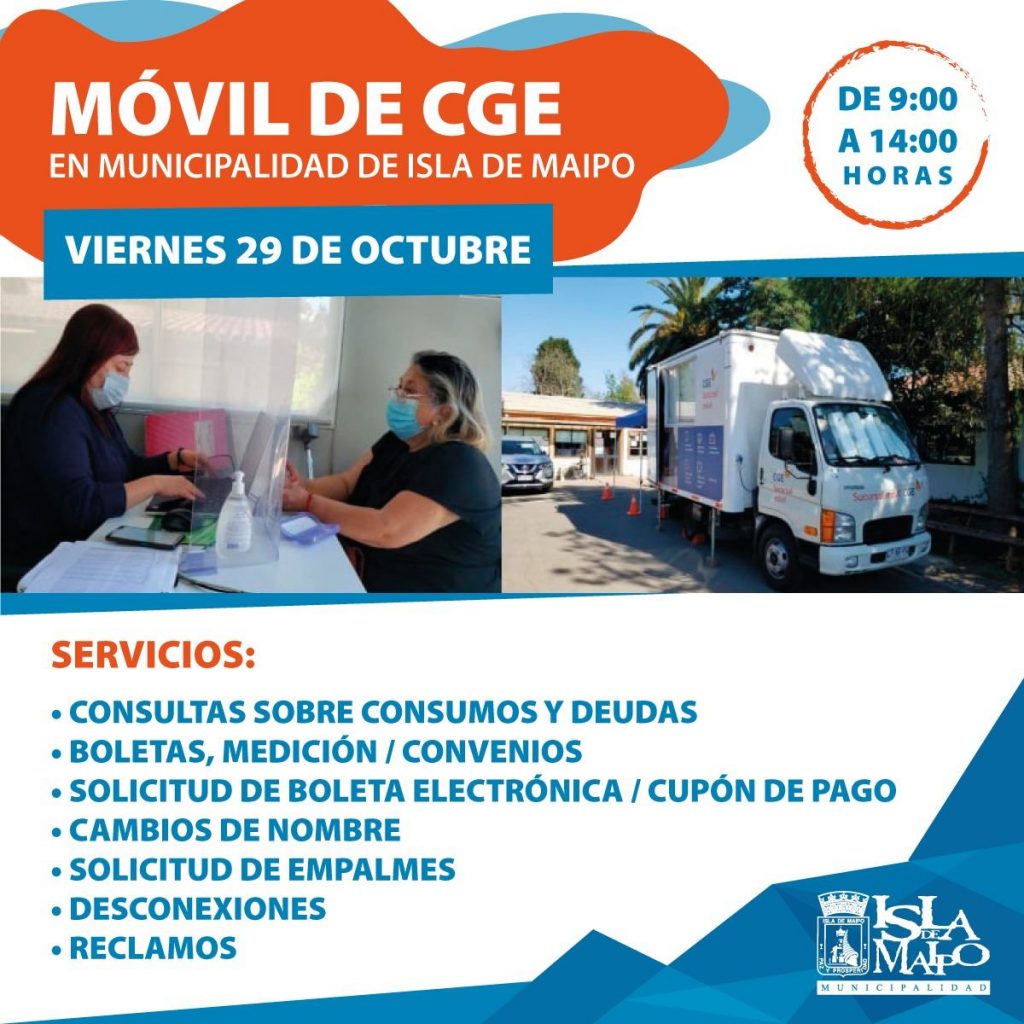El municipio de Isla de Maipo recibirá nuevamente la visita de la Oficina Móvil de la Compañía CGE Distribución. La atención a los vecinos se realizará el próximo viernes 29 de octubre, desde las 9.00 a 14.00 horas, al interior del edificio consistorial (Alcalde López #9).