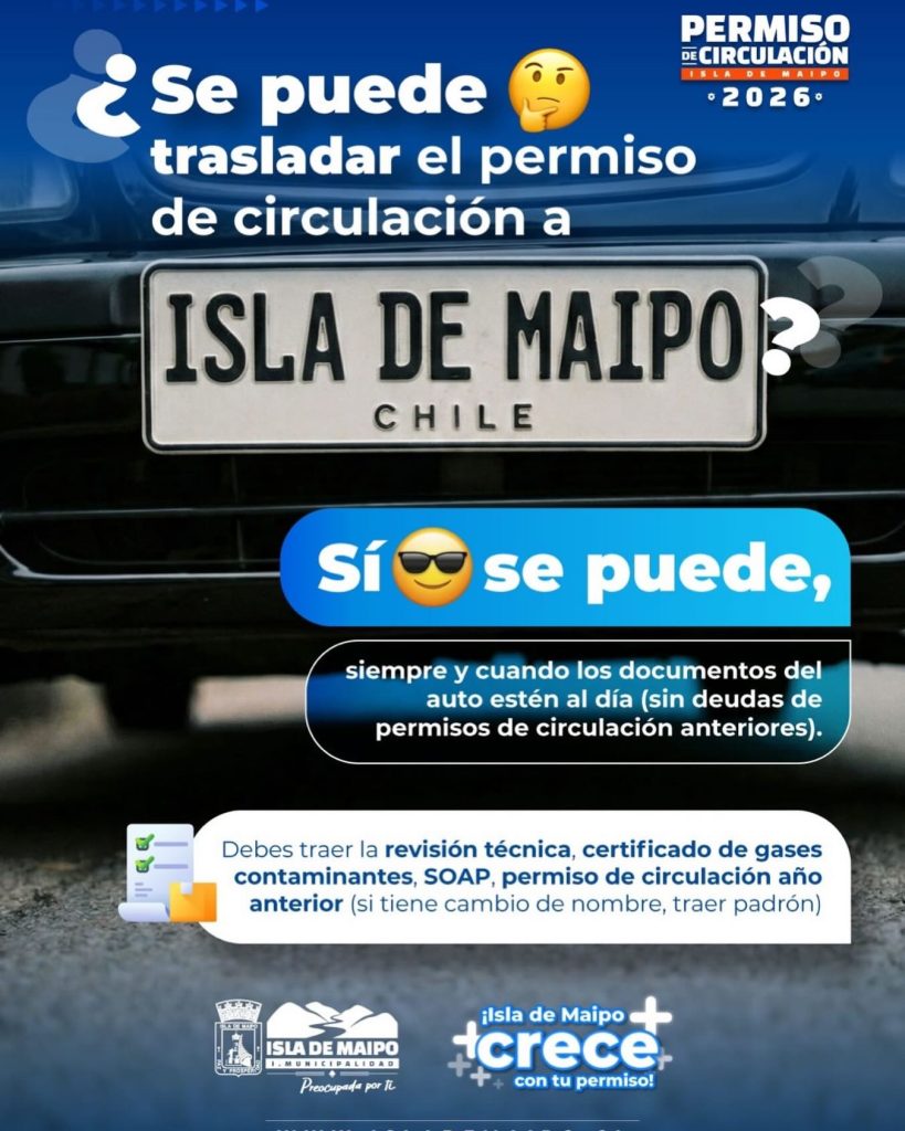 Si usted ha sacado su Permiso de Circulación en otra comuna y este año desea realizar el trámite en Isla de Maipo, el municipio recuerda que puede hacerlo bajo los siguientes requisitos: