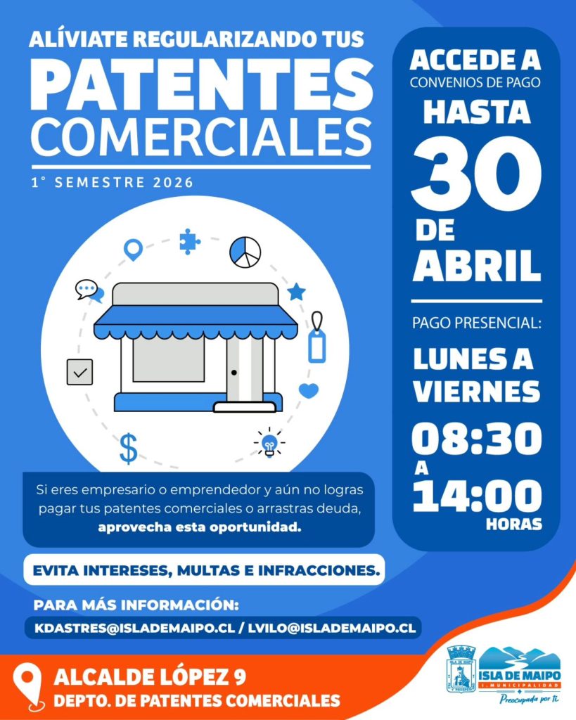 Hasta el 30 de abril se podrá regularizar el pago de la Patente Comercial, válido por el primer semestre de 2026 en Isla de Maipo. El llamado es a los locatarios rezagados a que puedan acceder a convenios de pago y evitar multas e intereses por estar fuera de plazo.