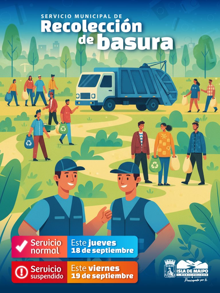 ¿Qué pasará este jueves 18 y viernes 19 de septiembre con el retiro de basura en Isla de Maipo? El municipio confirmó que el servicio de recolección de residuos domiciliarios en la comuna se entregará de manera normal este jueves, pero se suspende para el día viernes.