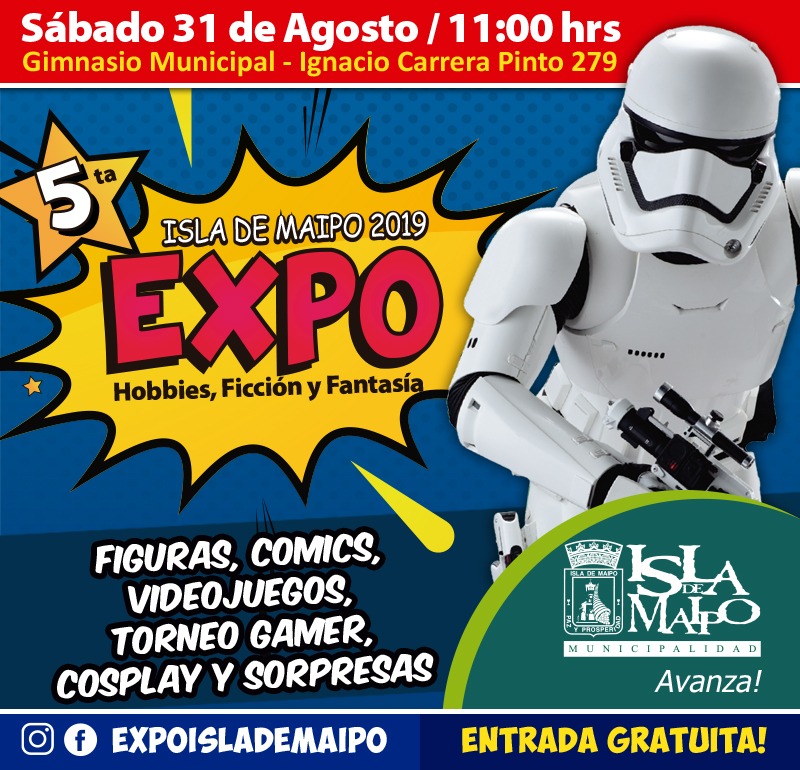 La 5° versión de la Expo Hobbies, Ficción y Fantasía de Isla de Maipo está confirmada para el próximo sábado 31 de agosto, con entrada liberada desde las 11.00 de la mañana, en el Gimnasio Municipal de nuestra comuna.