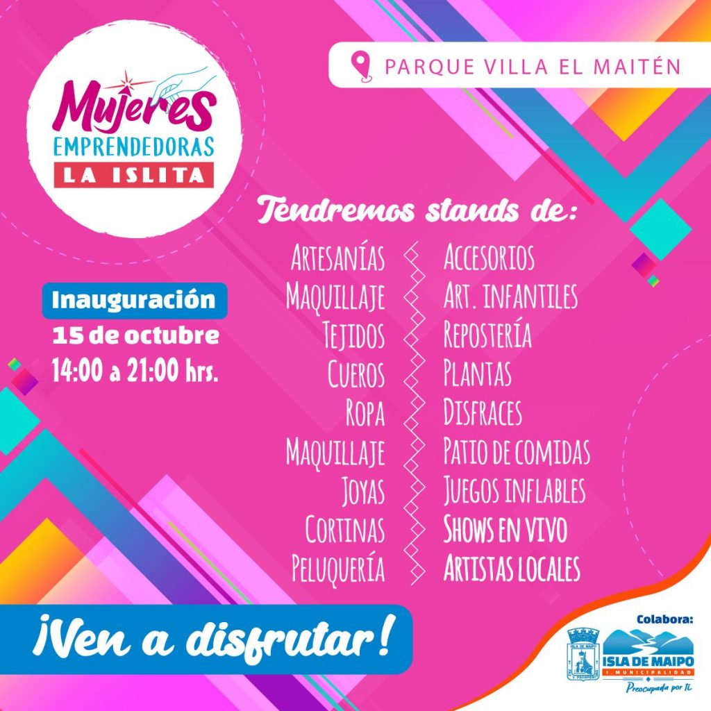 Un panorama familiar está programado para este sábado 15 de octubre, desde las 14.00 horas, en Parque de Villa El Maitén. Se trata de la Feria de Mujeres Emprendedoras de La Islita que contarán con los siguientes atractivos: artesanía, artículos para el hogar, prendas de vestir, repostería, maquillaje, cueros y joyas entre otros.