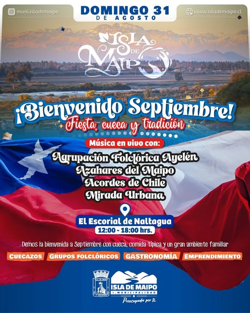 El municipio de Isla de Maipo invita a todos los vecinos a darle la bienvenida a septiembre con una gran fiesta llena de cuecas, comida típica y tradiciones en el Escorial de Naltagua. Actividad que se realizará este domingo 31 de agosto desde el mediodía hasta las 18:00 horas.
